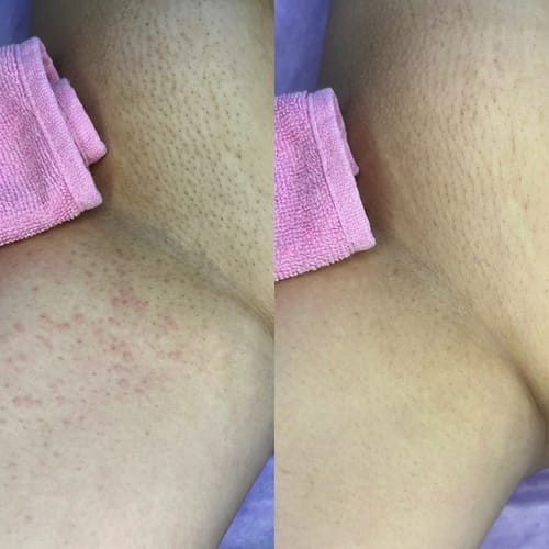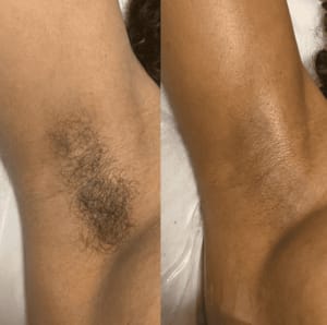 La photo avant est gênante mais elle est honnête. J'arrivais pas à suivre avec mes poils aux aisselles peu importe ce que je faisais. Me raser deux fois par jour parfois. Cette huile a pris environ 5-6 semaines mais regardez l'après. J'ai presque plus rien. Pas d'hyperpigmentation non plus. Juste de la peau lisse. J'aurais jamais cru poster mon aisselle sur internet mais voilà. Ce produit l'a mérité.