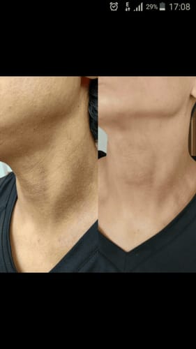 J'ai lutté contre une pilosité épaisse et foncée sur le cou à cause de problèmes hormonaux. L'ombre était visible même juste après le rasage. Après deux mois d'application régulière matin et soir, les poils ont considérablement diminué et l'ombre foncée a disparu. Je peux porter des décolletés confortablement maintenant. Très satisfaite.