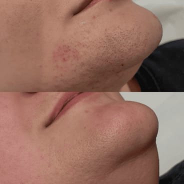 Le chaume au menton et les boutons de rasoir me gâchaient la vie. 4 semaines de cette huile et regardez la photo du bas. Lisse, pas de rougeurs, presque plus de points. J'ai arrêté de chercher des produits. C'est celui-là.