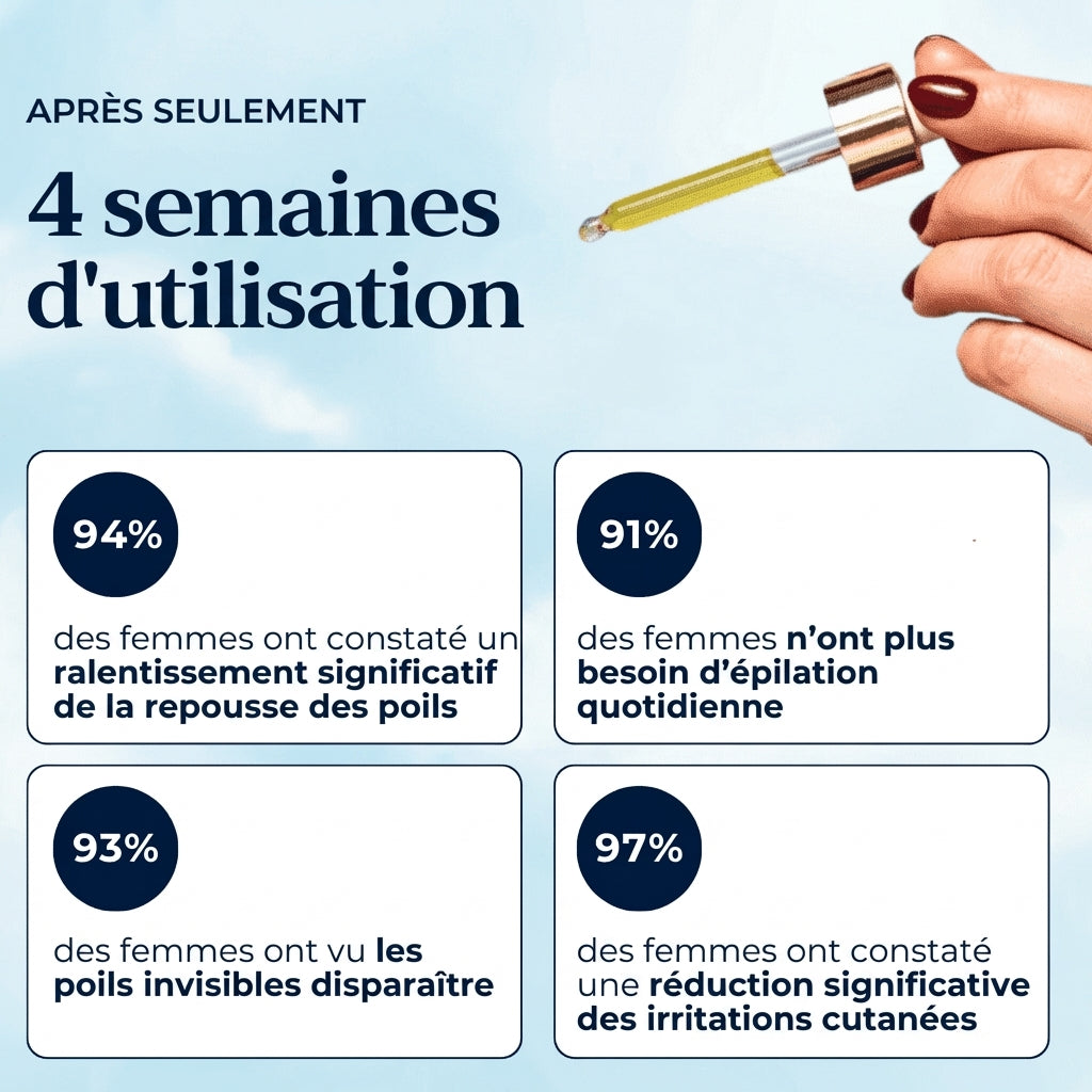 - Ce que vous allez remarquer : Semaine 2 — la repousse est plus douce au toucher. Semaine 4 — le poil est visiblement plus fin. Semaine 6 — vous sautez des jours sans y penser. Mois 2 — vous oubliez complètement.