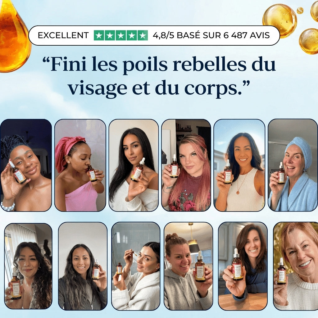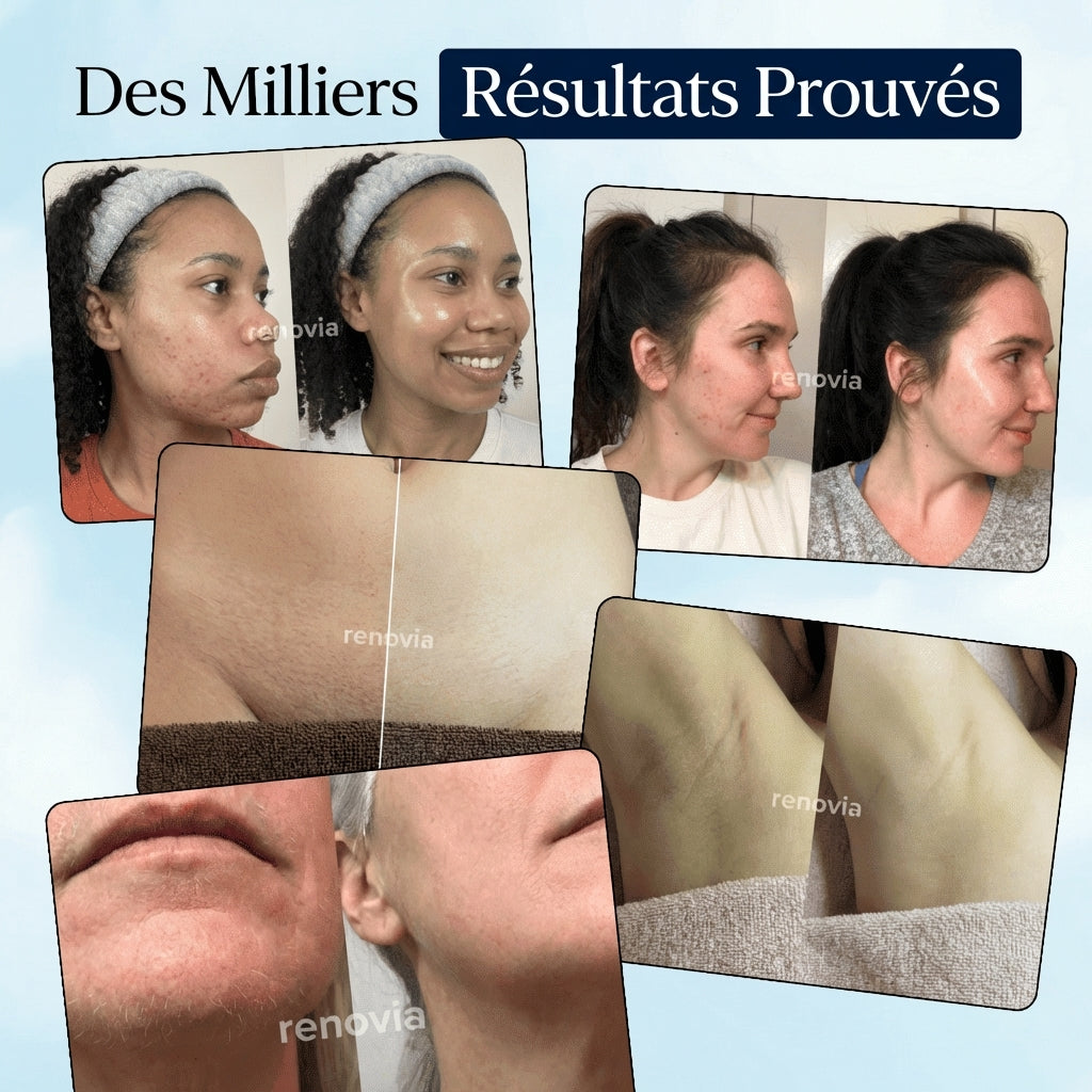 J'ai dépensé des milliers d'euros en laser et ça repoussait toujours. Épais, foncé, gênant. Ça fait 6 semaines que j'utilise Renovia et les poils s'affinent enfin. Je ne vérifie plus dans le miroir 10 fois par jour. Rien que pour ça, ça vaut le coup.