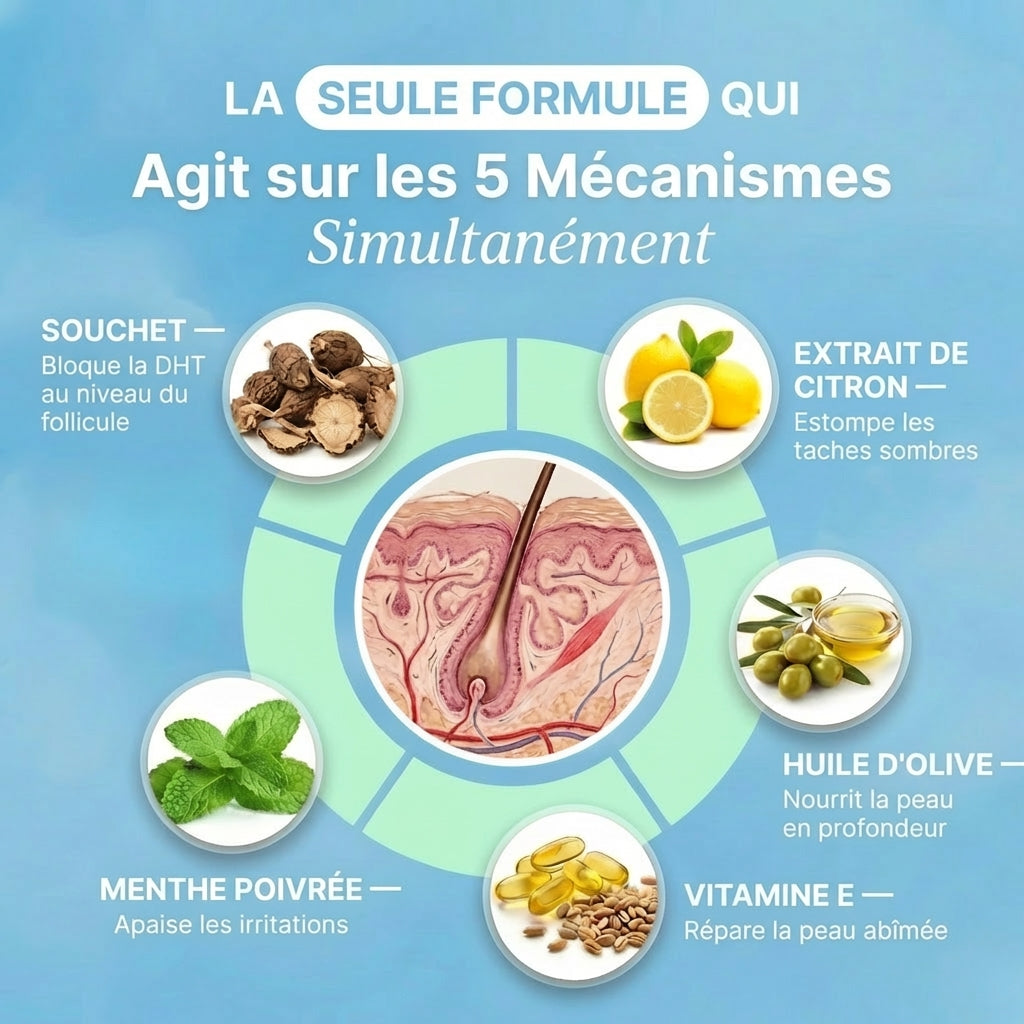 - Pourquoi ça repousse toujours : Le rasage coupe le poil à son point le plus épais. Barbe rugueuse en quelques heures. L'épilation à la pince l'arrache. Votre corps répare le follicule en le renforçant. Il revient plus épais. Rien de tout ça ne change ce qui se passe en profondeur. Le Cyperus Rotundus affaiblit le follicule lui-même. Le poil repousse plus fin, plus clair, plus lentement. Moins à chaque fois.